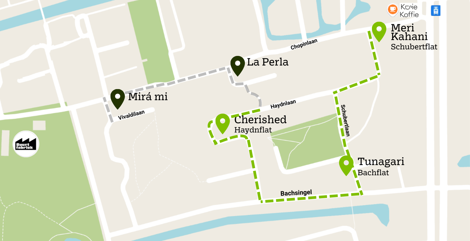 Op de Schubertflat zie je de muurschildering “Meri Kahani”, oftewel “Mijn Verhaal”, gemaakt door kunstenaar Laxmi Manuela. Dit kunstwerk is een co-creatie van buurtbewoners, Laxmi Manuela, Museum Prinsenhof Delft en het NOBIS Community Art-project van stichting CANIDREAM.