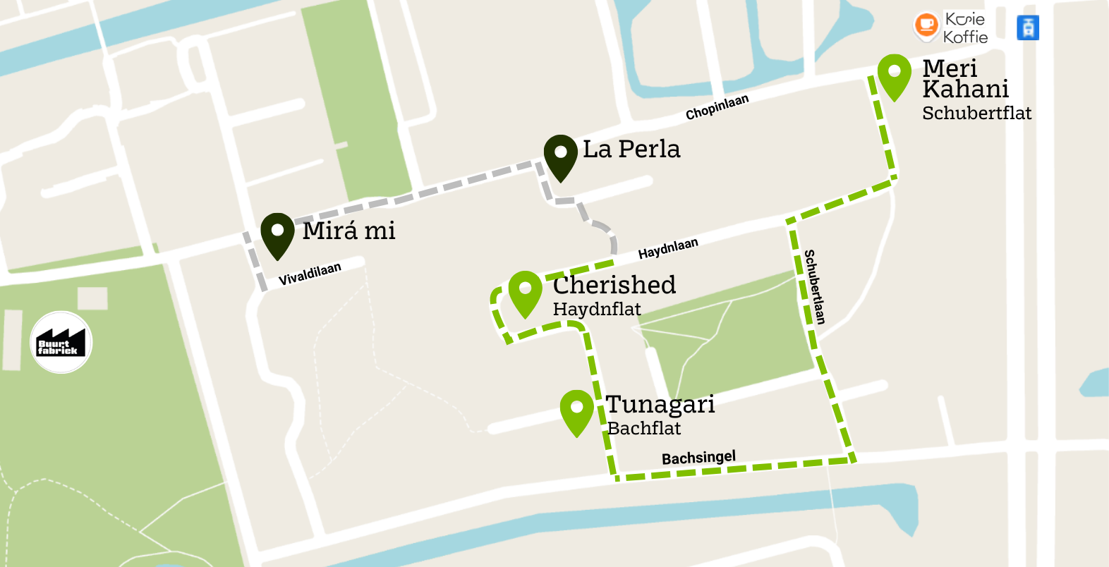Plattegrond met de vijf murals in de Gillisbuurt: La Perla door Tymon de Laat, Mira Mi door BEYOND, Cherished door BEYOND, Tunagari door Kensuke Miyazaki, Meri Kahani door Laxmi Manuela
