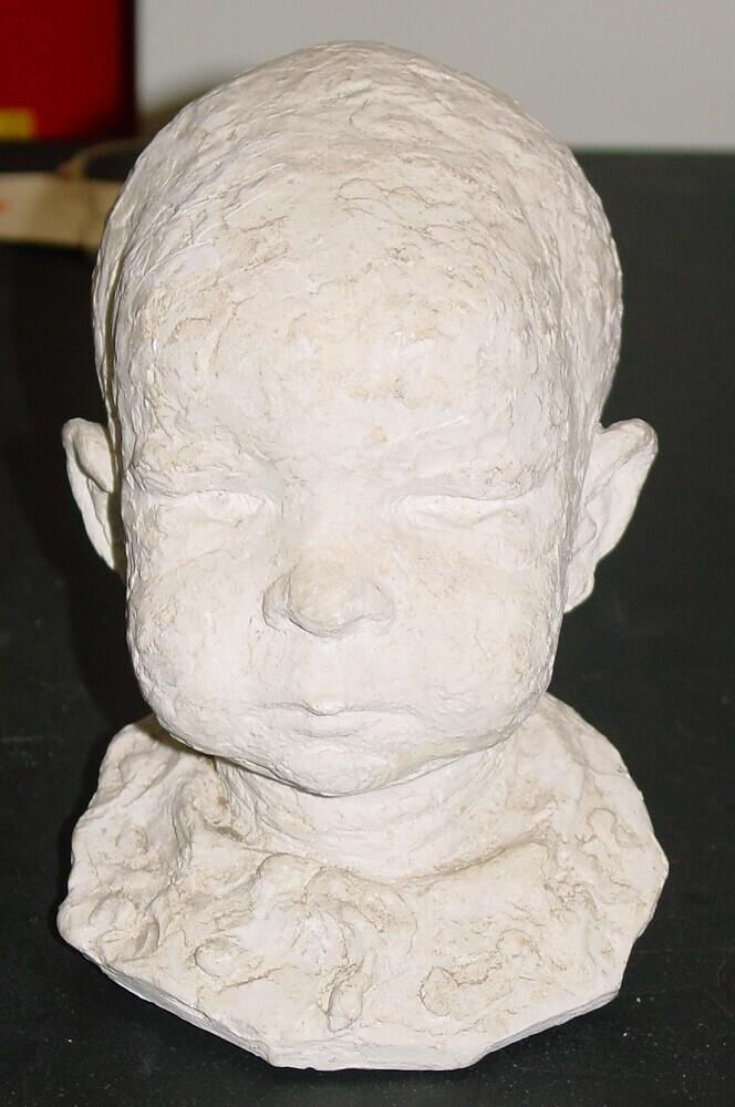 Beschrijving van het (kunst)werk: Kinderportret (waarschijnlijk nog zeer jong). Een bol gezicht met geprononceerde oren en zeer dun weergegeven haar. Onder aan de nek een kraagje (?)
