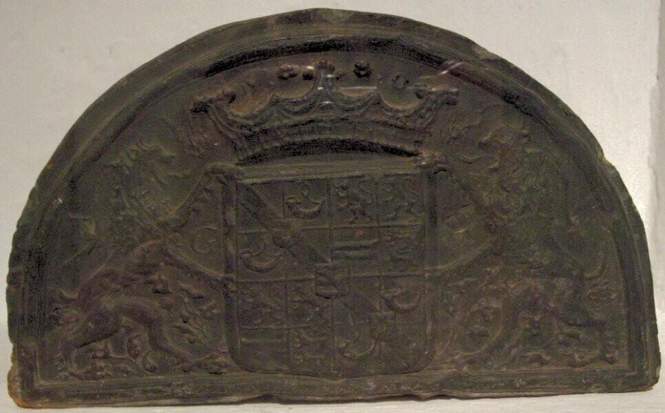 Haardsteen met het wapen van Oranje-Nassau. Twee kwartieren van het gekroonde schild staan voor het prinsdom Orange (linksboven en rechtsonder met een hoorn), de andere twee gedeelde kwartieren verwijzen naar Nassau, Katzenellenbogen, Dietz en Via...