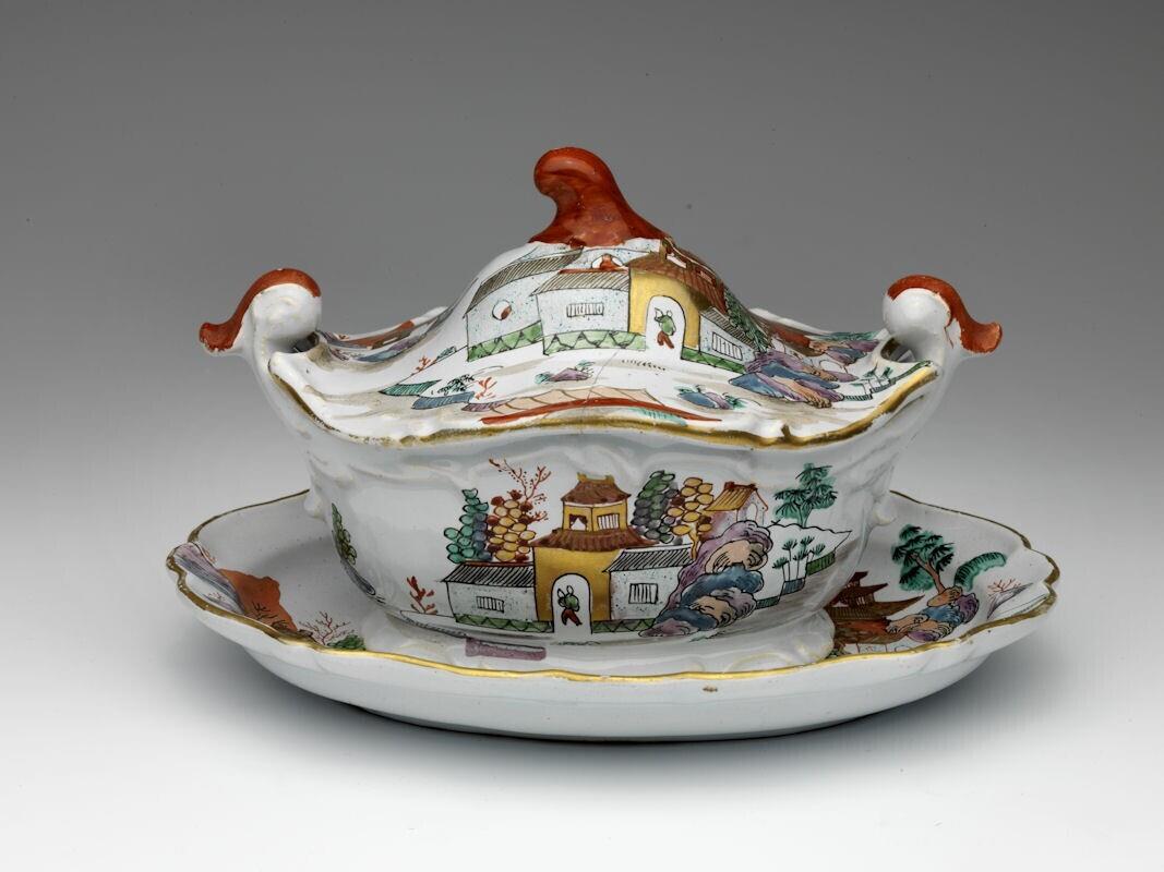 Ovaalvormige, gedekselde botervloot of terrine met deksel en onderschotel in rococostijl, gedecoreerd met Chinese landschapjes met pagodes.