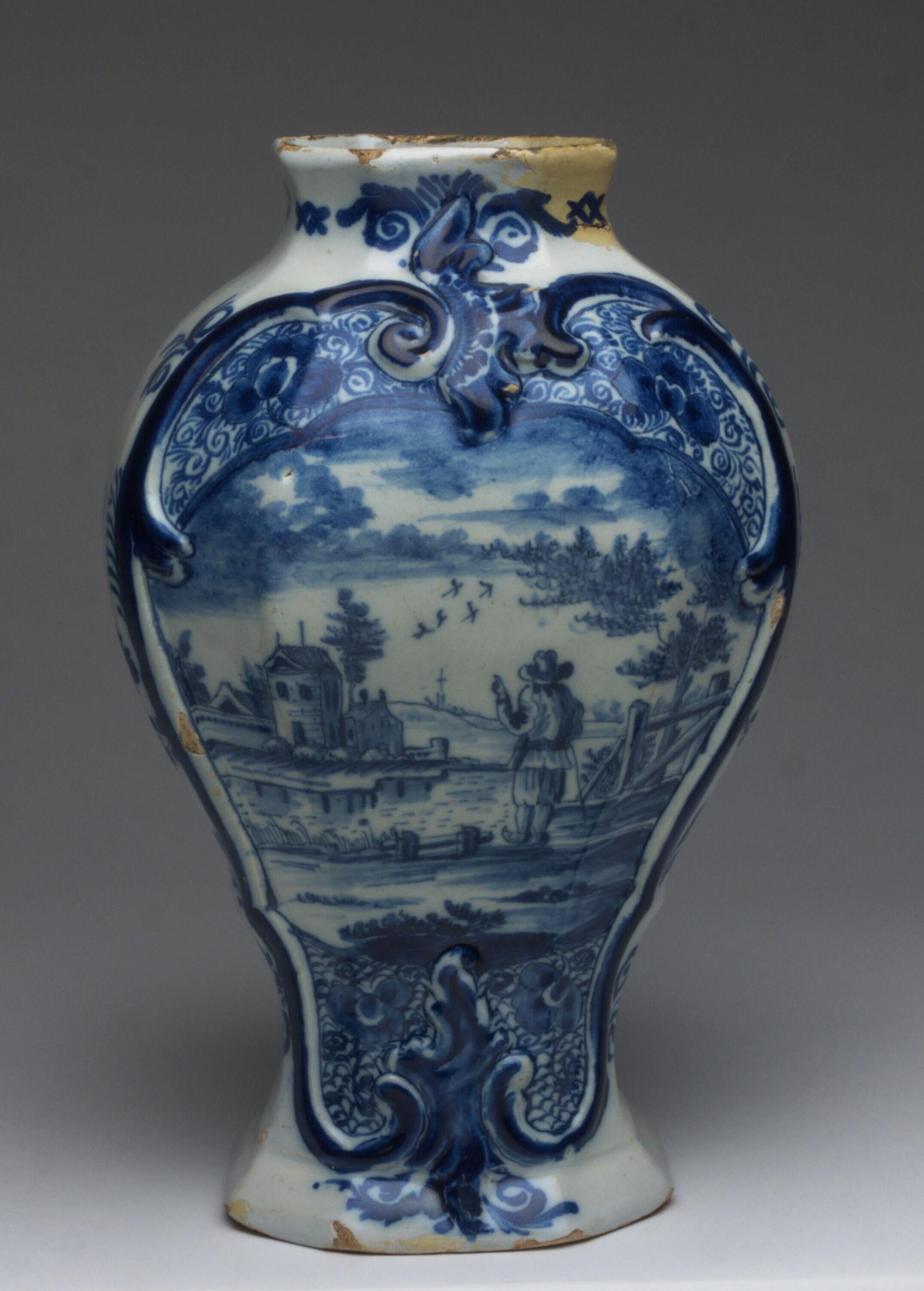 Tot het assortiment van Jacobus Harlees behoren eveneens balustervormige, achthoekige potten die aan de voorkant beschilderd zijn met tussen twee banden gevat bloemwerk en een door schubben omgeven florale decoratie. De beschildering is omgrensd d...
