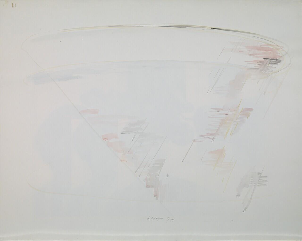 Diagonale streep van linksboven naar middenonder, links daarvan wit vlak, rechts daarvan diverse roze vlakjes, flauw gebogen lijn bovenaan