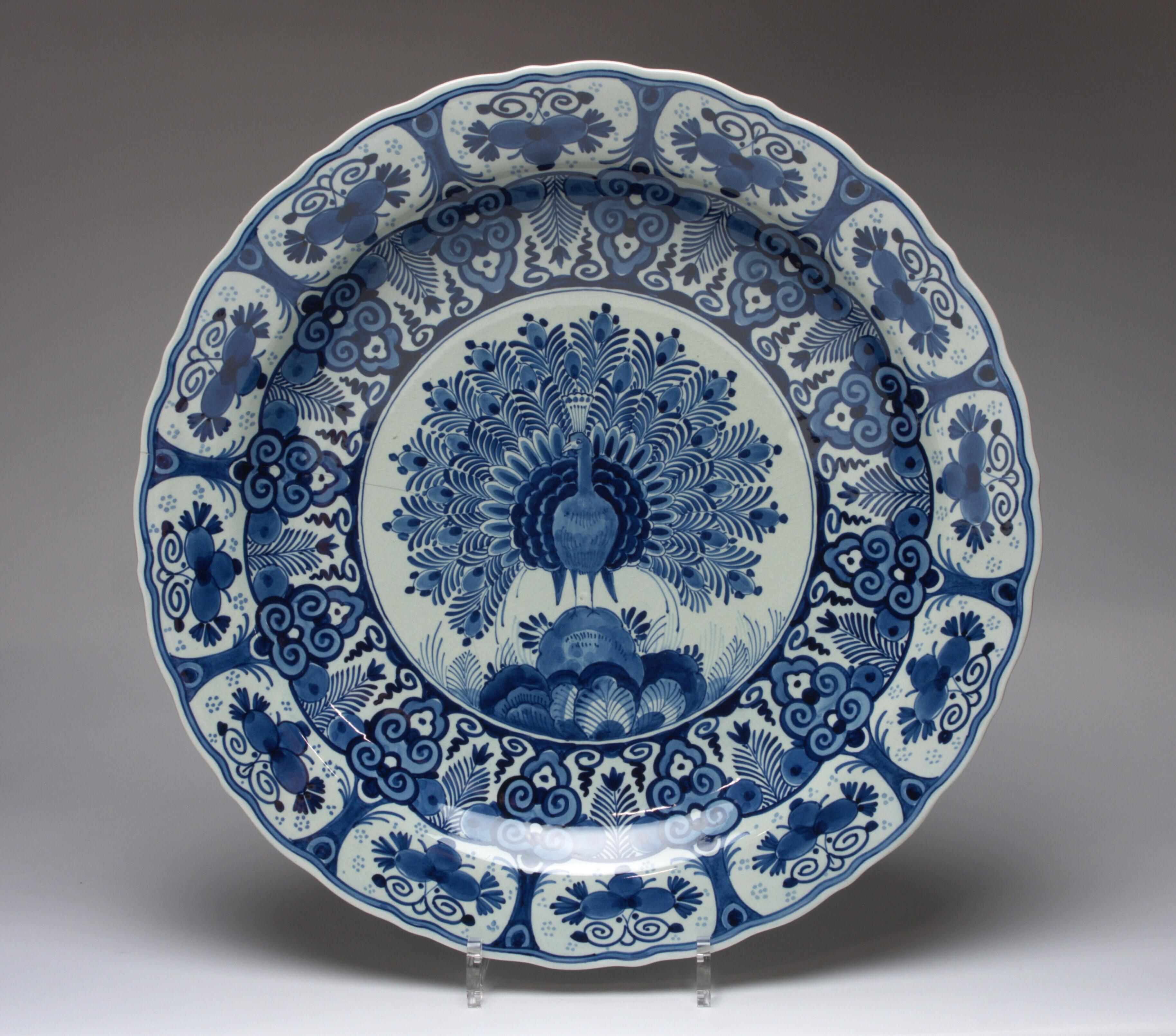 De met standring uitgevoerde schotel toont een voorstelling van een pauw met uitgewaaierde staart op een rots. Deze slechts op het plat weergegeven decoratie wordt omcirkeld door een puntige, naar buiten gerichte band. De buitenrand tenslotte word...
