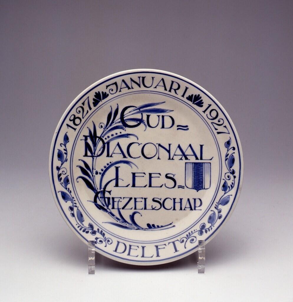 Bord met op het plat met de ronding meelopende lauwertak waardoorheen de beginletters geschilderd zijn van de woorden Oud- / Diaconaal / Lees- / Gezelschap. Rechts het wapen van Delft en op de rand tussen siertakjes en bladornamentjes het opschrif...
