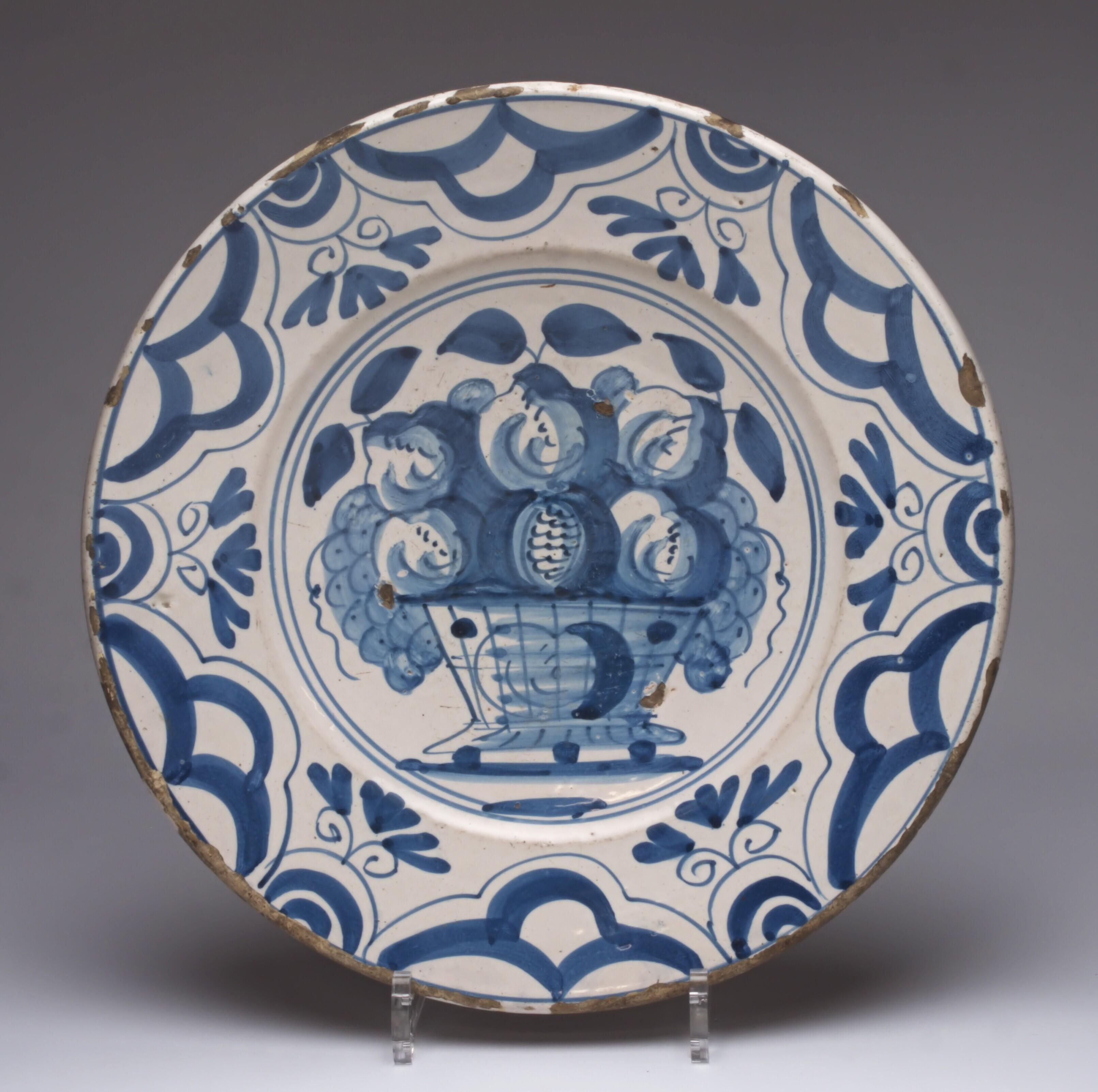Schotel, rond met verdikte rand, op standring, met op het plat een vruchtenmand (druiven en granaatappels) in cirkellijst. Op de rand gestileerde ranken afgewisseld door gestapelde boogjes. Grove beschildering.