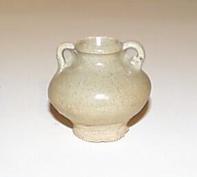 Het vaasje is bolvormig en heeft gegolfde oren, een ingesnoerde hals, een verdikte monding, een convexe voet en een vlakke bodem.