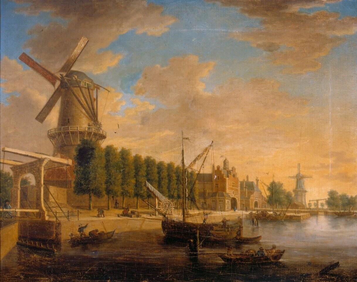 De Schiedamse poort, ook wel Ketelpoort, en de Rotterdamse poort, ook wel St. Jacobuspoort. Ruim een eeuw na Vermeer schilderde Isaac van Haastert de beide stadspoorten. De weergang van de Rotterdamsepoort was toen al lang afgebroken.