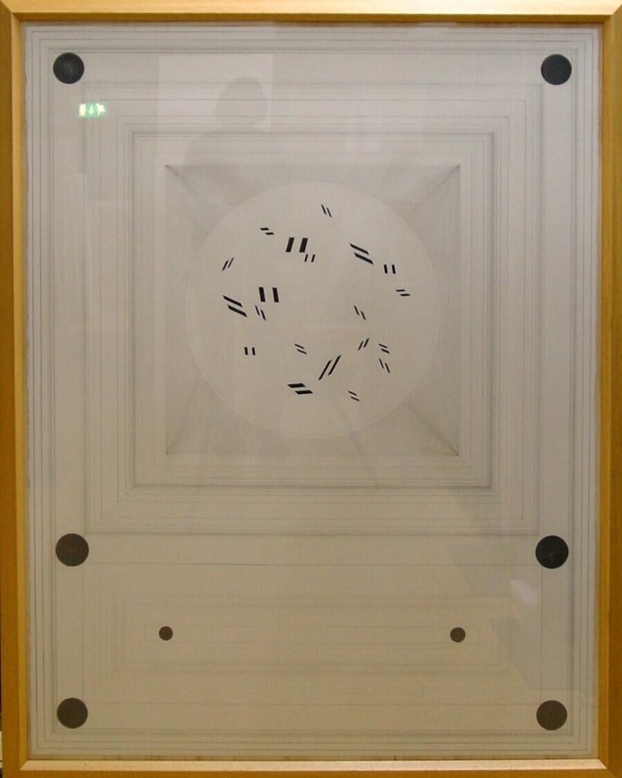 Het werk bestaat uit dunne potloodlijnen; de bovenste helft uit vierkanten, daaronder een rechthoek. In het midden van het vierkant een grote open cirkel, gevuld met kleine 'zwevende' ruitvormige motiefjes. Op de hoeken van vierkant en rechthoek z...