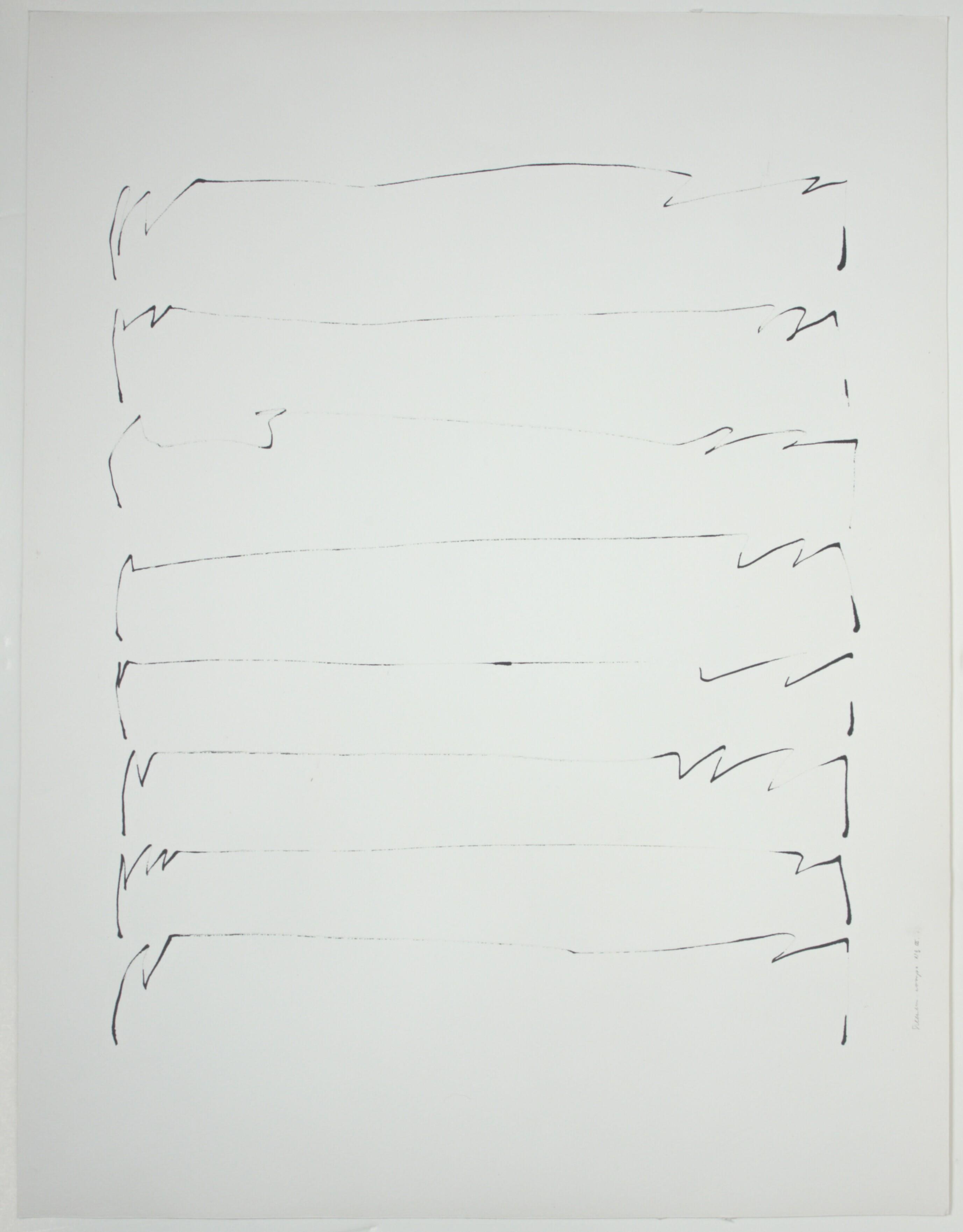 Acht lijnen zijn onder elkaar geplaatst. Aan begin en eind van de 'regel' zigzagt de lijn: begin en eind liggen lager dan de rest van de lijn. Hierdoor ontstaat een structuur van zich herhalende lijnen, waardoor ruimte tussen die lijnen wordt gecr...