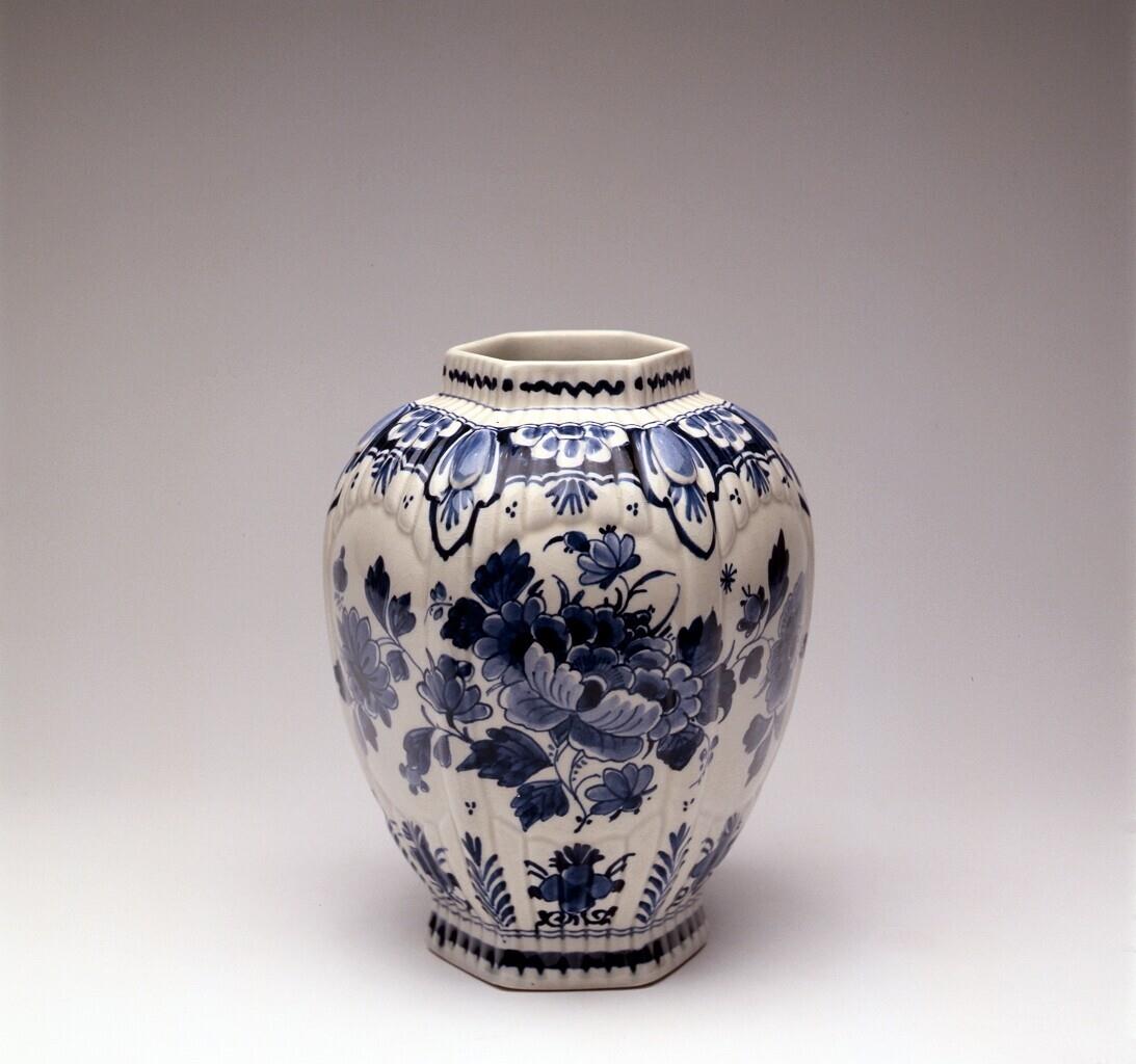 De zeshoekige vaas is aan de voorkant beschilderd met een bloementoef, die uitloopt in ranken. Deze beschildering is weergegeven op het gladde middendeel van de pot. De boven- en onderkant zijn daarentegen geribd. De zes vlakken worden geaccentuee...