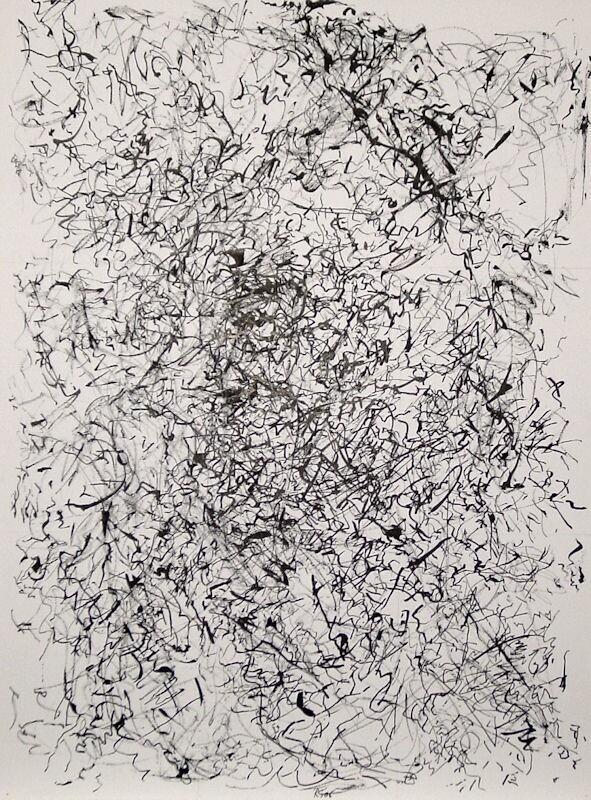 Beschrijving van het (kunst)werk: Over een raster van horizontale en vertikale potloodlijnen is een wirwar van lijnen, krasjes aangebracht. De lijnen zijn soms zwart, soms grijs.