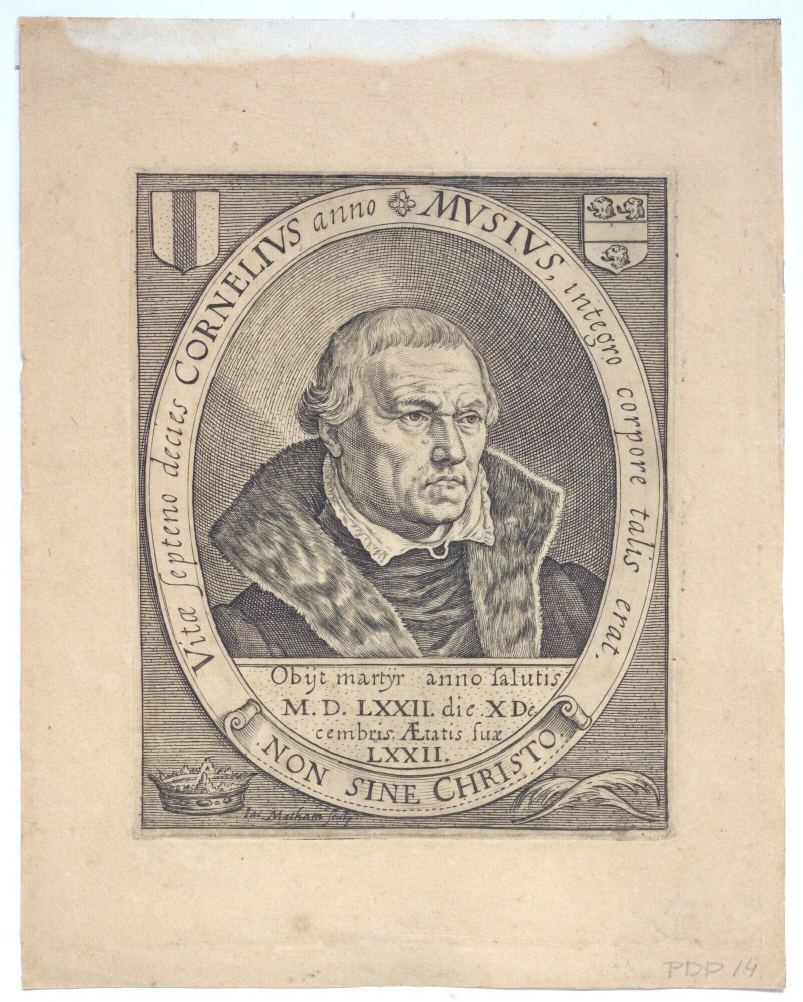 Portret van Cornelis Musius (prior van het St. Aagten - St. Agata - klooster te Delft), buste naar rechts met opstaande bontkraag, in ovaal met randschrift