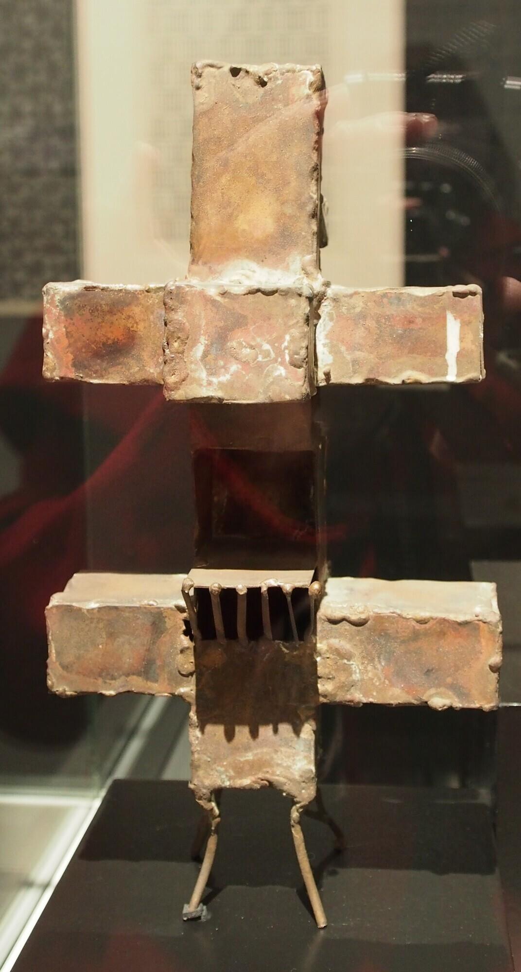 Een constructie van rechthoekige ruimtelijke doosjes. Een lange staande doos (deze vormt de as van het werk) waaromheen, iets onder elkaar, zich als het ware twee 'liggende' griekse kruizen zijn gemonteerd. Het geheel staat op vier dunne, enigszin...