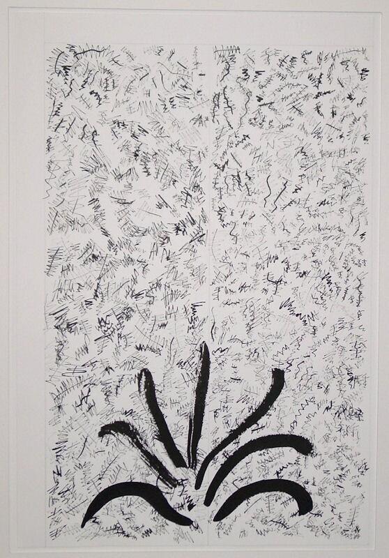 Beschrijving van het (kunst)werk: Het blad is (met potlood) in een linker en een rechter helft verdeeld. De twee vakken die zo ontstaan zijn gevuld met zigzaggende krabbels op lijntjes. Onderaan in het midden zijn zeven brede zwarte penseelstreken...