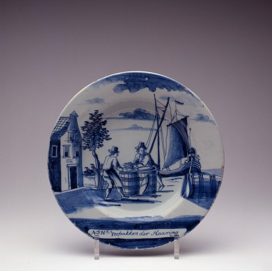 Rond bord met standring, tiende bord uit een serie borden met voorstellingen van de haringvangst.