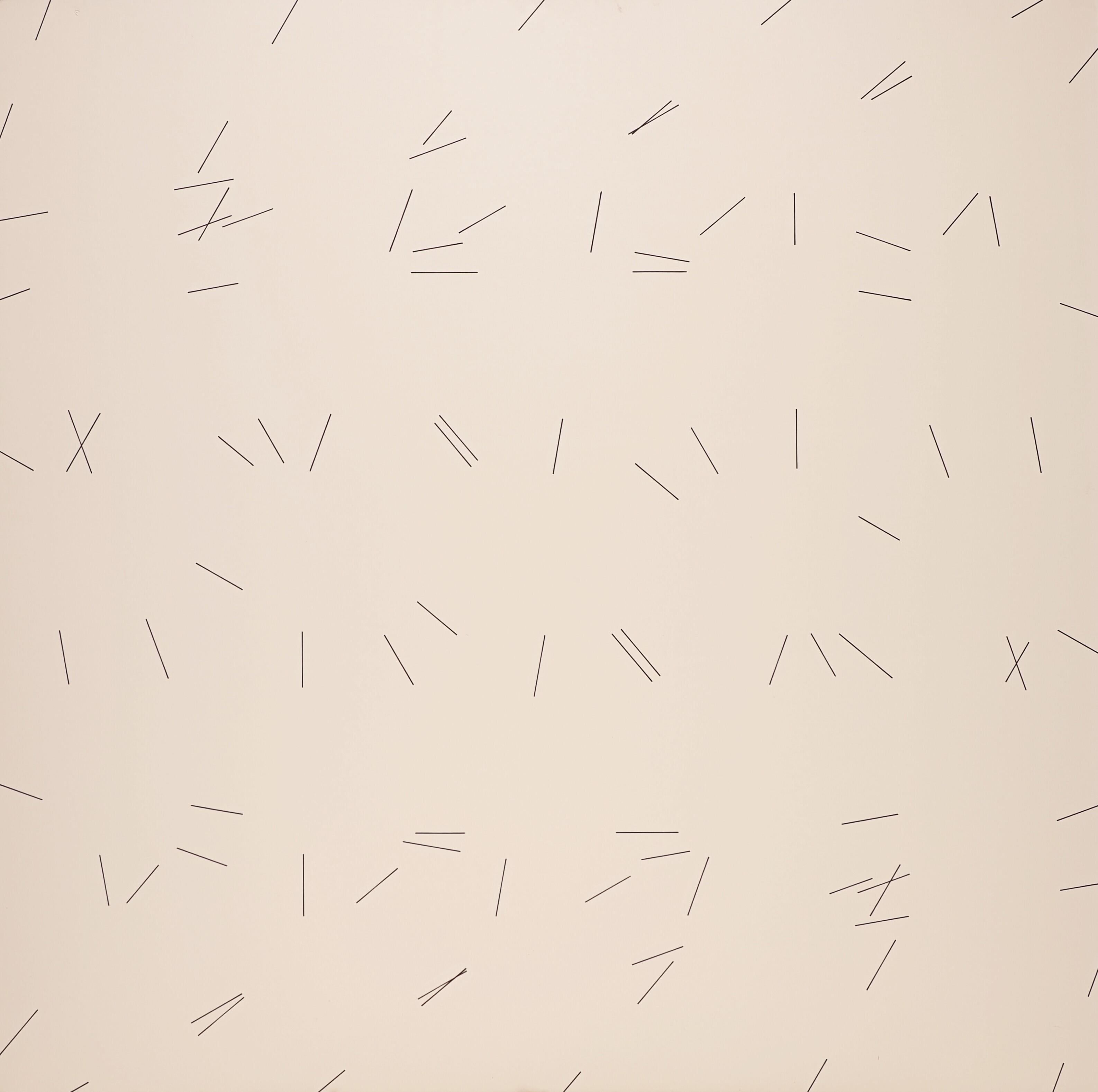 In een onregelmatige groepering zijn korte zwarte streepjes op een witte ondergrond geplaatst.