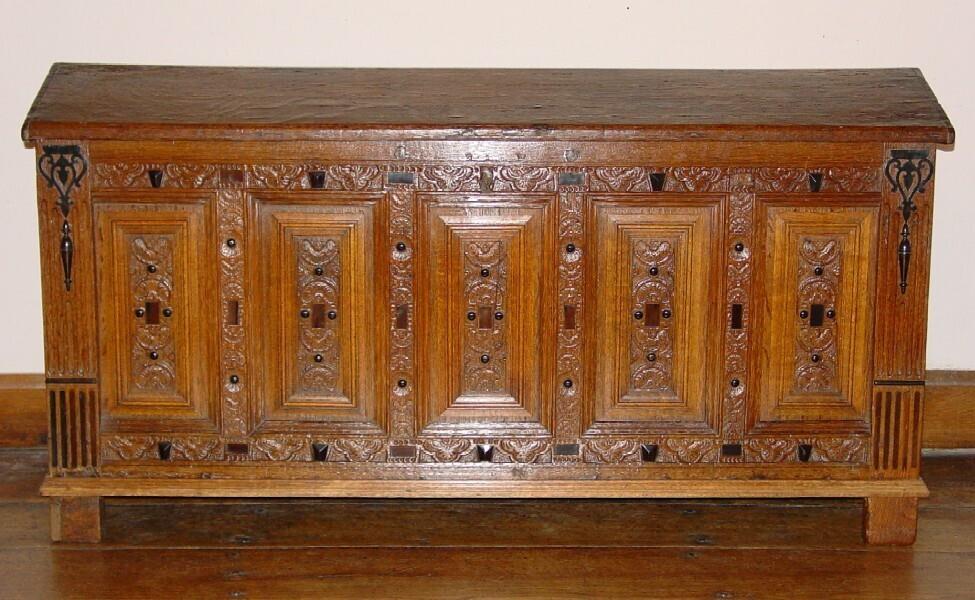 Met verhoogd dak van eikenhout met decor van ebbenhouten gespen en doppen. In het voorbord vijf panelen met snijwerk, zijkanten twee bewerkte panelen, achter vijf onbewerkte panelen. Voorzijde ontbreekt in bovenregel rechtsboven een stukje ebbenho...