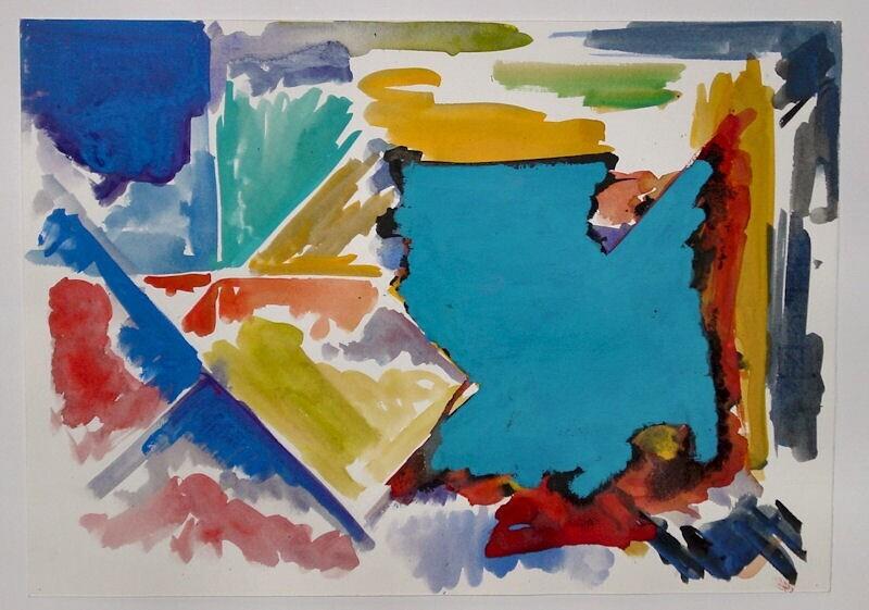 Beschrijving van het (kunst)werk: Rechts een grote felblauwe afbuigende pijl. Links kleurvlakken, geplaatst in een soort 'kleurencirkel' in blauw-groen-geel-rood. Waterige vlekken in felle kleuren.