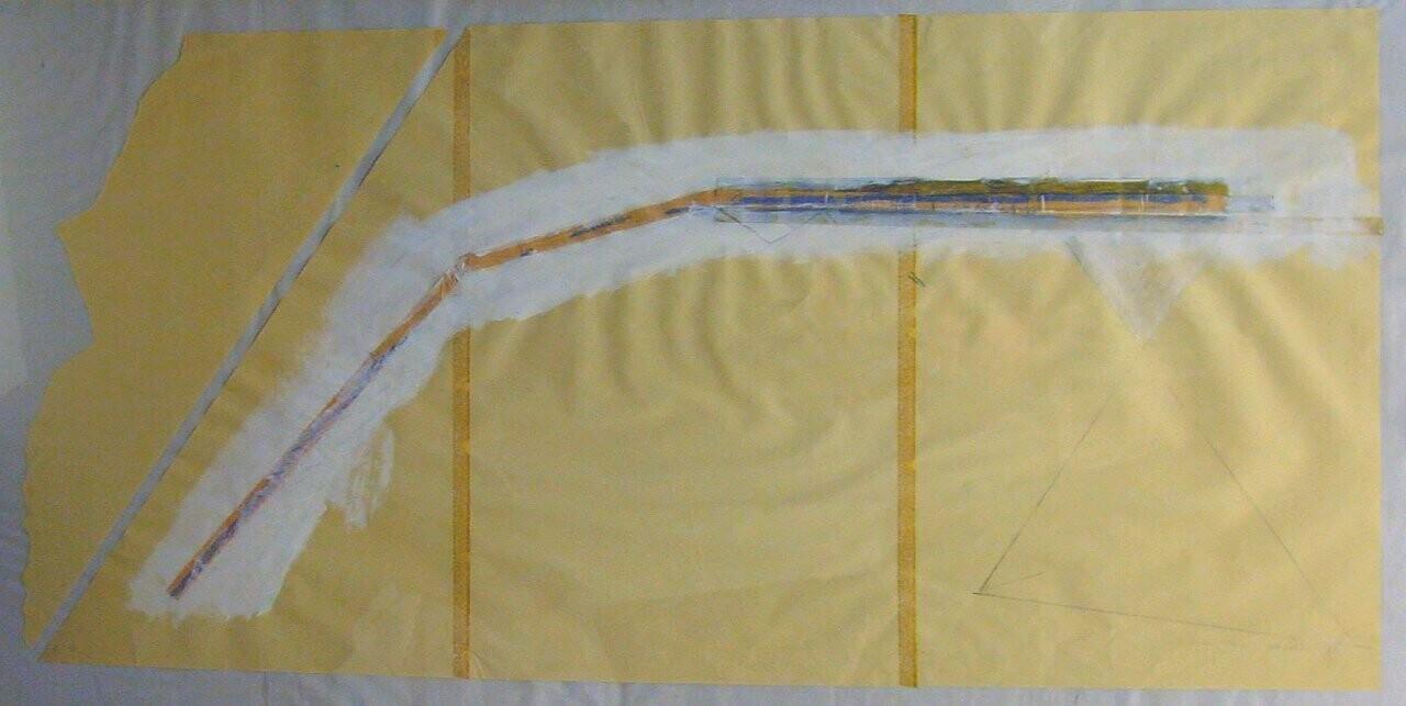 Drie vellen papier, naast elkaar geplaatst. Uit het linkervel, dat aan de zijkant is afgescheurd, is diagonaal een reepje papier gesneden. Evenwijdig hieraan is iets daaronder een strook plakband geplakt, omgeven door witte verf. Deze lijn loopt d...