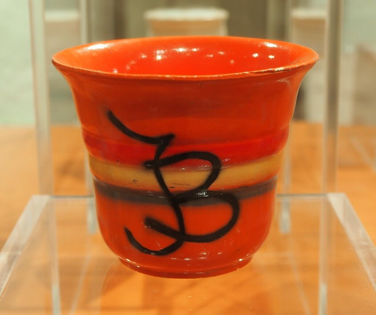 Oranje beker met monogram JB, Juliana en Bernhard, en een rood-wit-blauwe bandring.