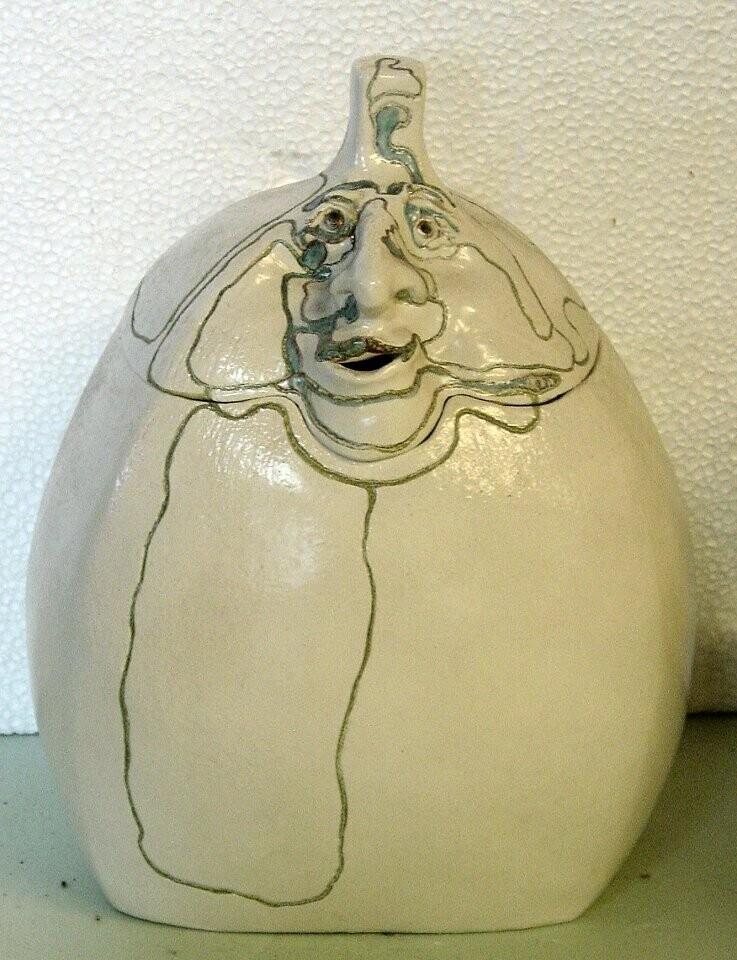 Beschrijving van het (kunst)werk: De enigszins bolvormige pot met deksel is wit geglazuurd. Op het deksel is aan de voorzijde een gezicht weergegeven, dat deels geboetseerd is, en dat deels door middel van ingekraste en met blauw en groen ingekleu...