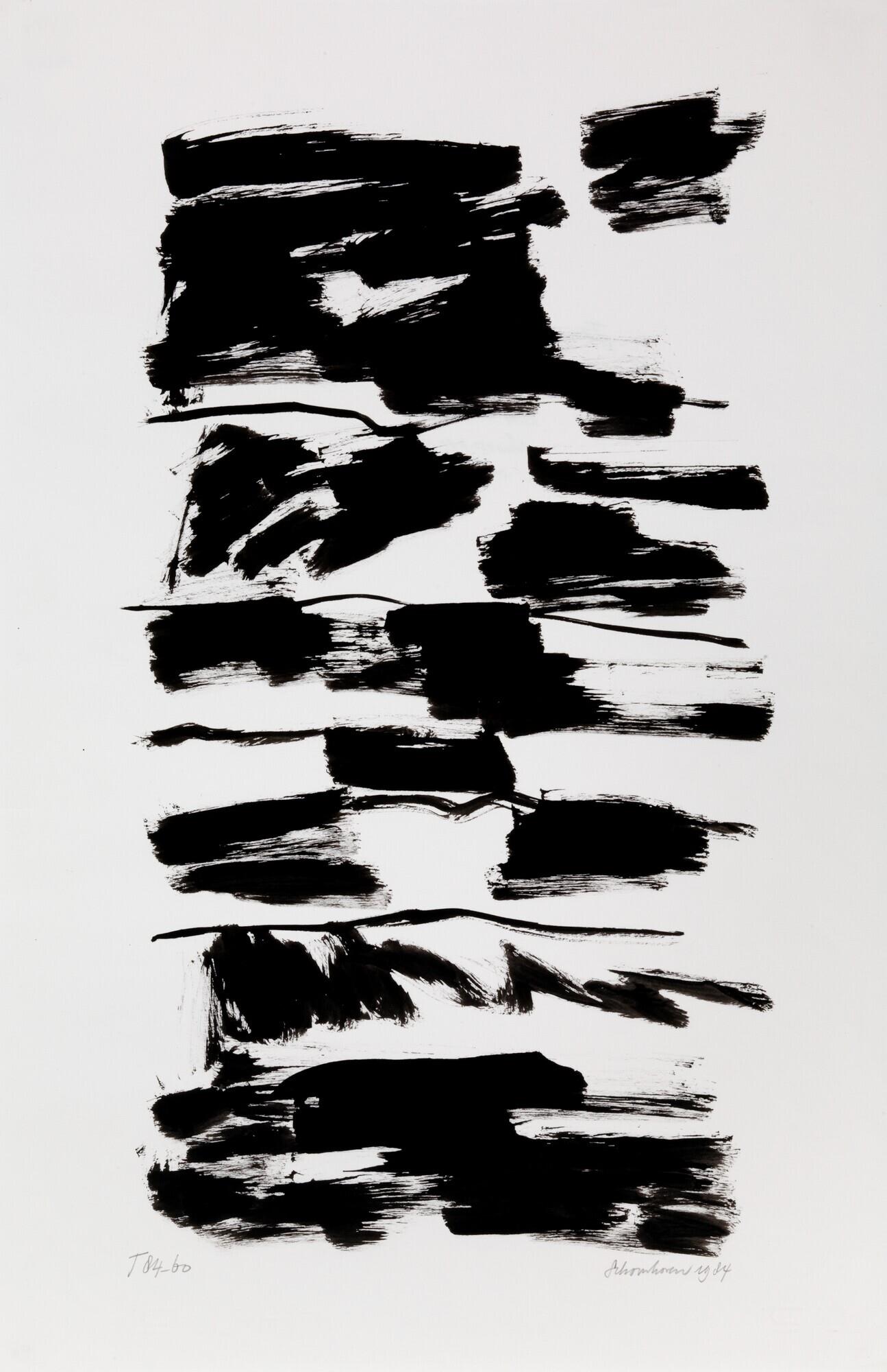 Binnen een denkbeeldig kader zijn brede, overwegend horizontale zwarte penseelstreken op het papier gezet, op losse en onregelmatige manier. Door horizontaal op enige afstand van elkaar een smalle, doorlopende lijn te plaatsen ontstaat een vierdel...
