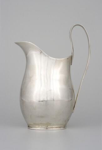 Het gladde kannetje is ovaal van doorsnede en rust op een standring, versierd met een filetlijst. Het hoog omgebogen oor is iets hol gebogen en gevuld met een filetlijst. Op de buik is een helmteken aangebracht van een zwaard met een weegschaal in...
