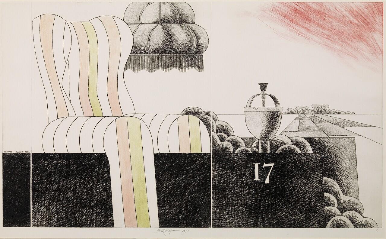 Een grote gestreepte fauteuil, met daarboven een lamp, en daarnaast een staande asbak. Dit geheel wordt afgeschermd door zwarte vlakken met op een van hen het cijfer 17. Naast de stoel bevinden zich ook 'bollen' (struikachtig/ wolachtig) Het tafer...