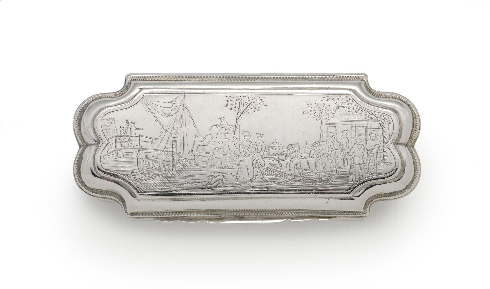 - Tabaksdoos met daarop een afbeelding van waarschijnlijk een jaarlijks zomeruitje naar de buitenplaats. Spullen gaan mee met de wagen en de mensen gaan zelf met de schuit