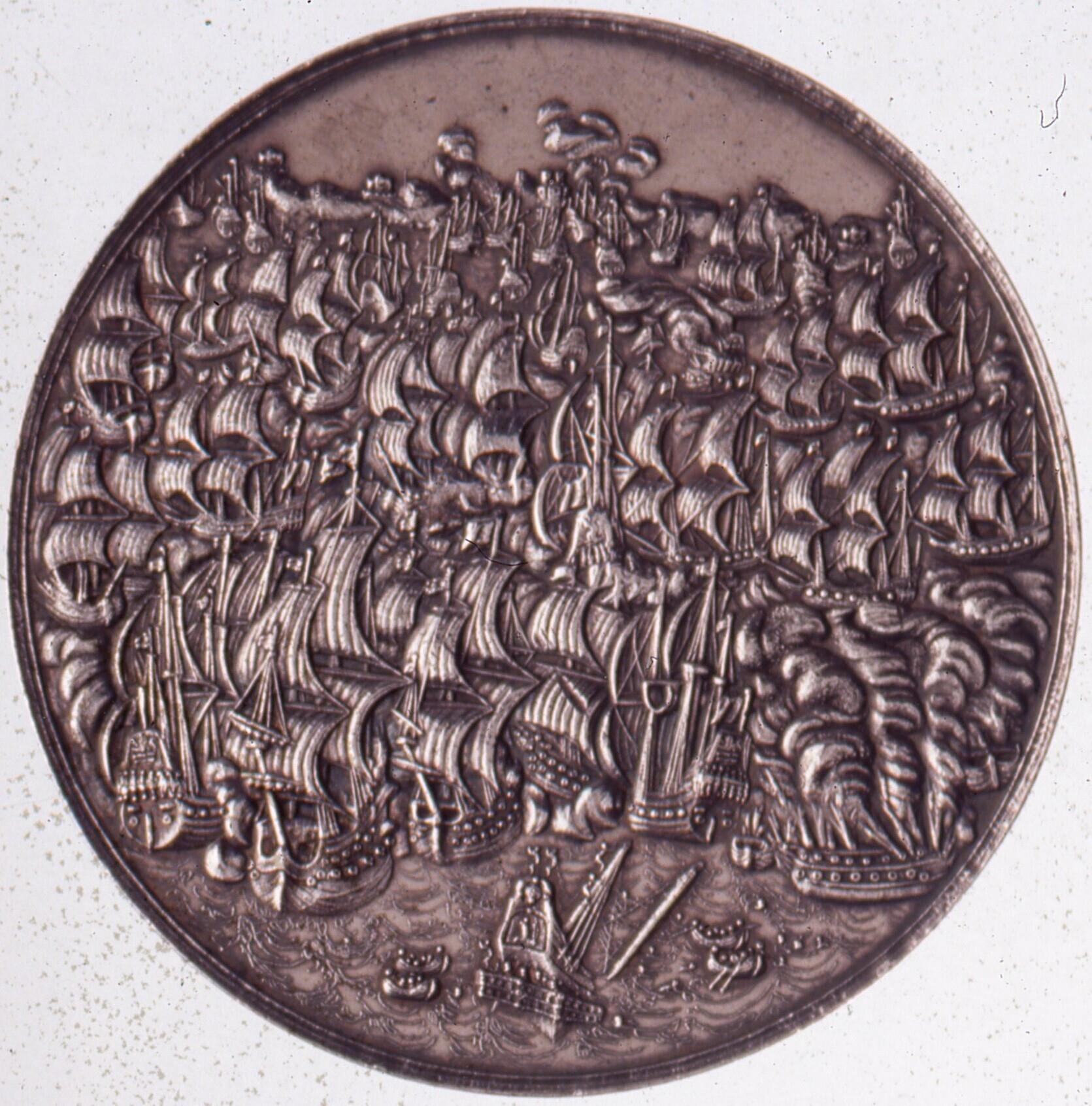 Op de voorzijde van deze penning is het verslaan van de Spaanse Armada voor Duins door Maarten Tromp afgebeeld. De voorstelling toont een hoeveelheid aan schepen die hevig met elkaar in gevecht zijn. Er is geen stukje van het oppervlak leeg gelate...
