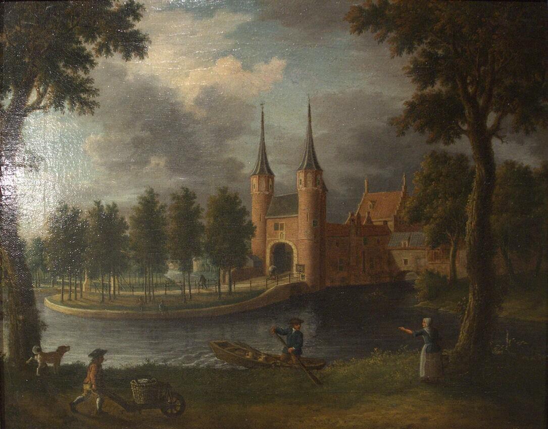 De Oostpoort, ook wel St. Catharijnepoort, van buiten de stadsmuren van Delft af gezien