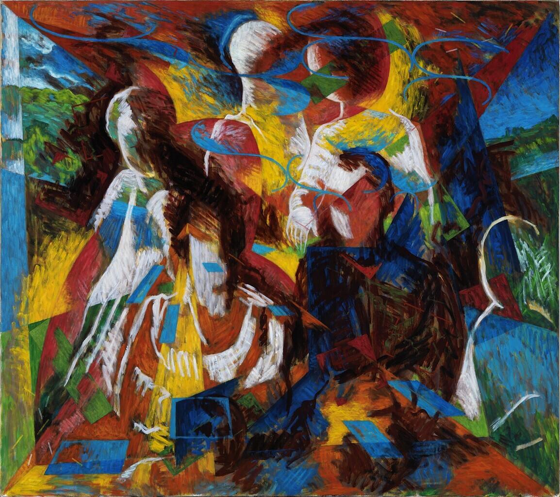 In een veelheid van gekleurde vlakken zijn vaag (witte) contouren van mensfiguren te onderscheiden. In de vlakken zit enige systematiek: ze lopen als het ware ondanks onderbrekingen in andere kleuren / vlakken toch door.
