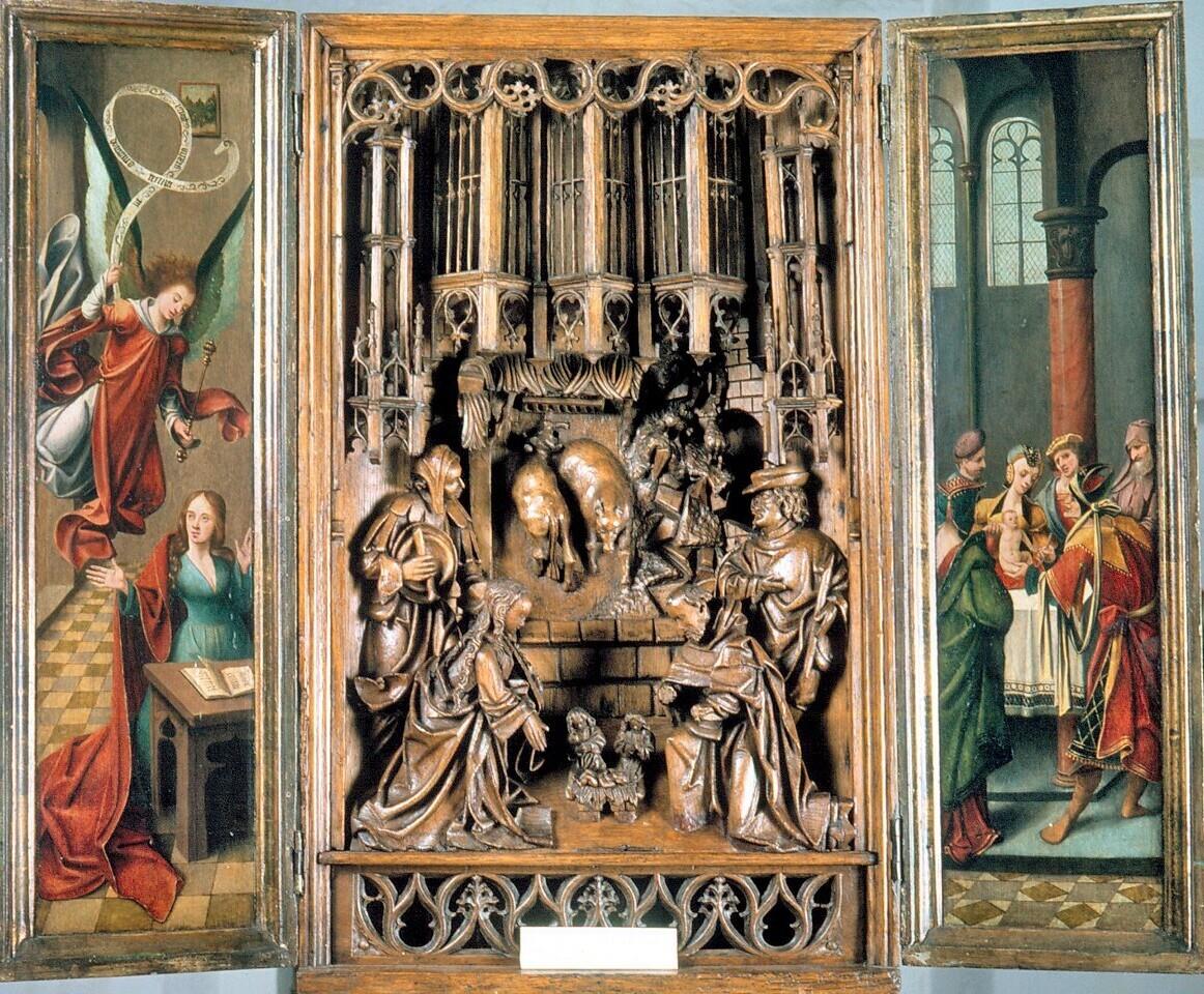 middenpaneel bestaat uit houten sculptuur met de voorstelling van de geboorte van Jezus in een stalletje; aanbidding herders; de twee zijpanelen zijn beschilders. links: annunciatie (Maria boodschap) (25 maart; op deze dag wordt door de engel Gabr...