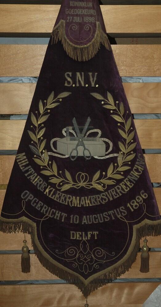 paars fluwelen vaandel met in een gulden bladerkrans kleermakersattributen; bovenin 'Koninklijk goedgekeurd - S.N.V. - Militairekleermakersvereeniging - opgericht 1896 - Delft'