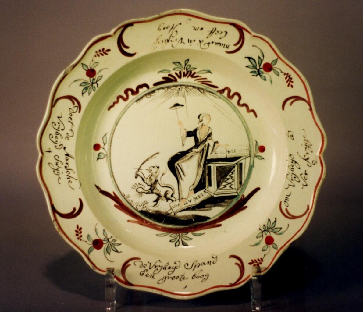 Sierbord met op het plat een patriottisch tafereel met leeuw en Nederlandse maagd.