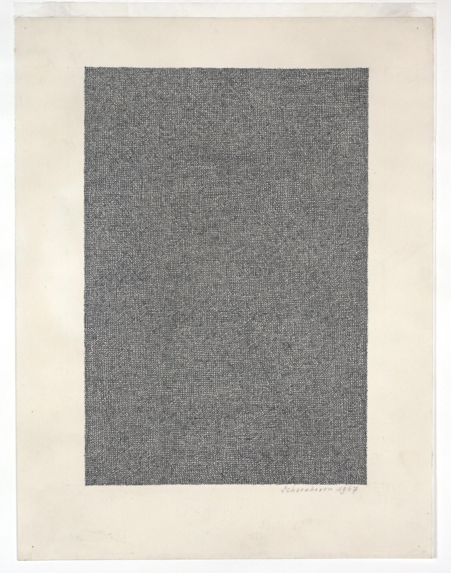 Het hele vlak is gevuld met dicht naast en over elkaar geplaatste horizontale, verticale en diagonale lijnen, waardoor een zeer fijnmazige structuur ontstaat, die echter niet geheel gelijkmatig is en daardoor op sommige plaatsten bijna ondoorzicht...
