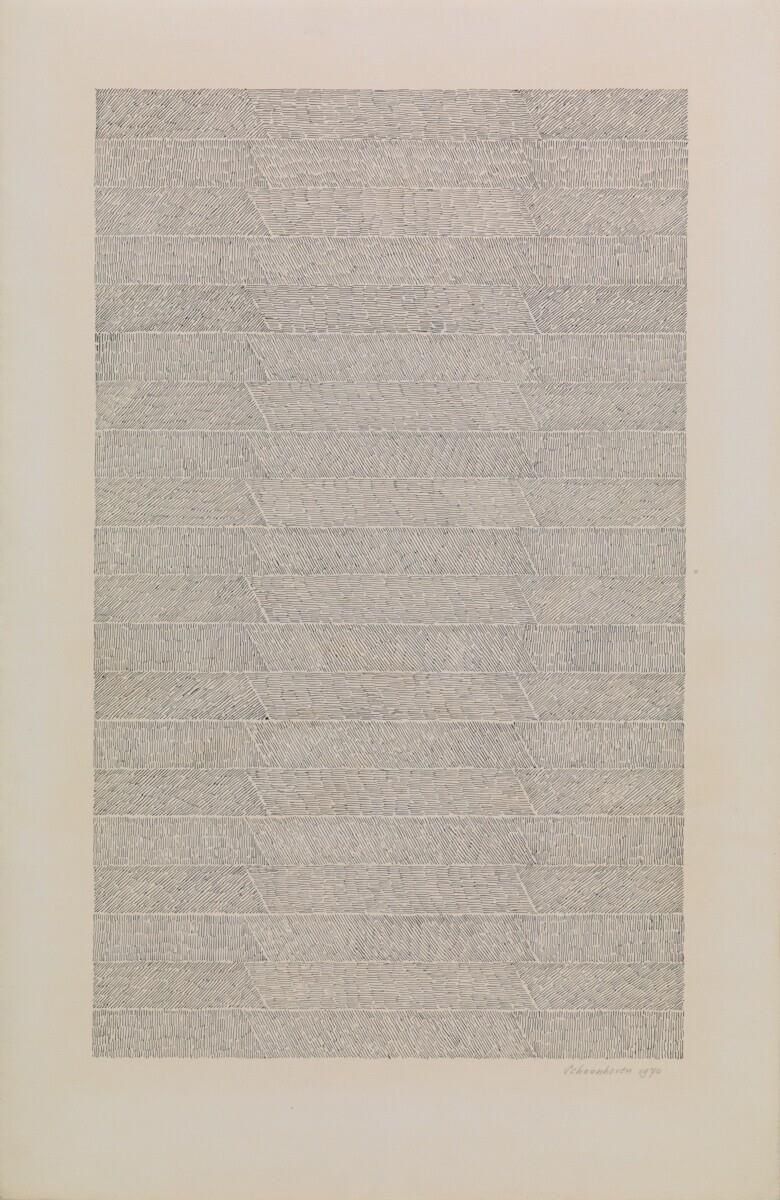 Het werk bestaat uit 3 vertikale banen, waarbij de linker- en rechterbaan van boven naar beneden afwisselend vertikaal en diagonaal zijn gearceerd en de middelste...