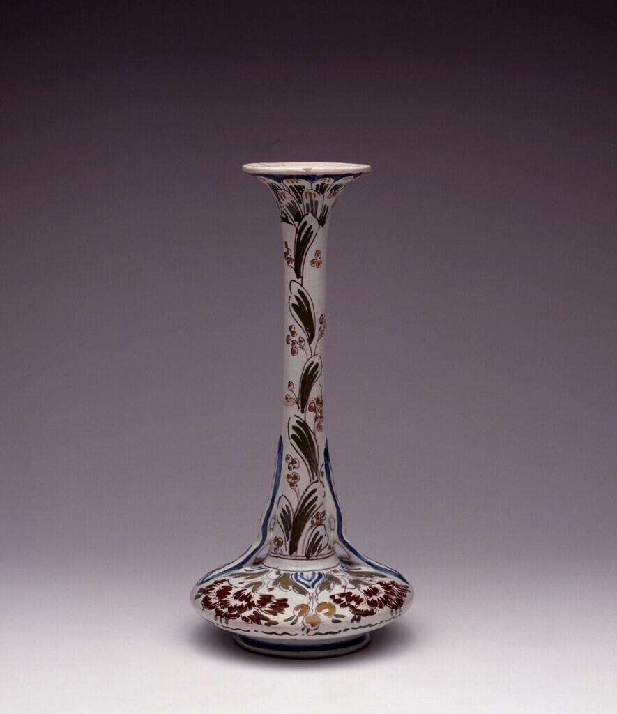 De met een fraai decor beschilderde vaas maakt deel uit van een groep voorwerpen die tot het tinglazuuraardewerk behoren. Vanaf circa 1895 trachtte de latere technisch directeur H.W. Mauser (1868-1940) de techniek van het traditionele Delftse tin...