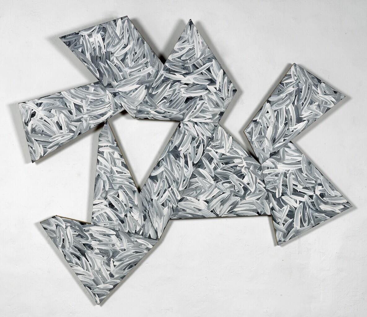 Op elkaar gemonteerde samengevoegde geometrische vormen. Hierop grijs met witte, kronkelige verfstreken.