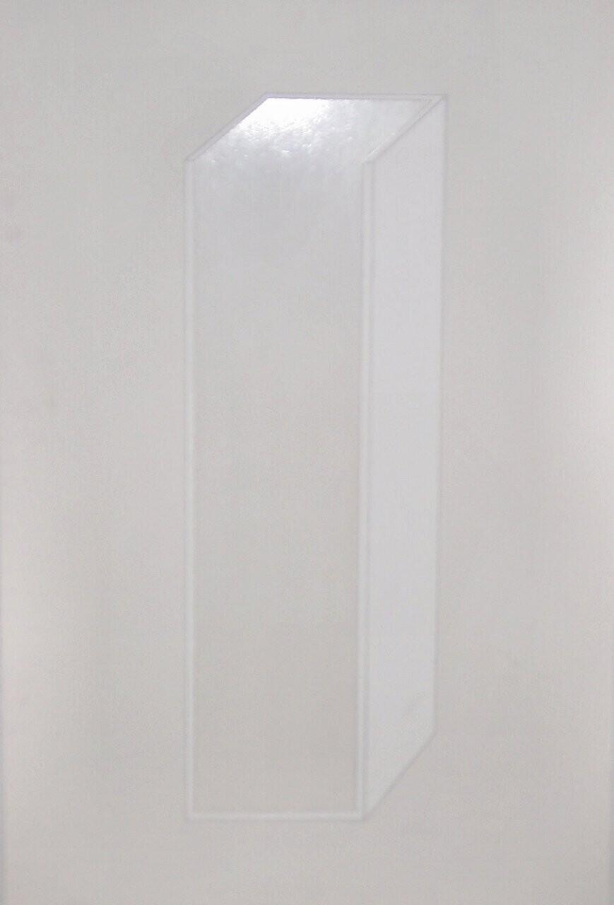 Beschrijving van het (kunst)werk: Een witte, ruimtelijk getekende rechthoekige staande vorm is geplaatst tegen een gebroken witte achtergrond. De vorm is aan de voorzijde open, en egaal met grijs ingevuld.