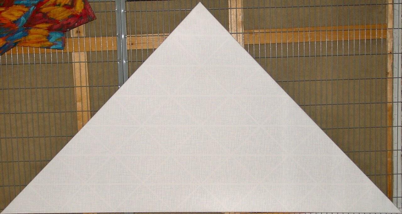 Een in een driehoek (basis breder dan de zijden lang zijn) opgespannen doek, waarop kleine driehoekjes opgebouwd uit horizontale en verticale streepjes dit doek geheel vullen en een structuur vormen van naast, onder en boven elkaar geplaatste drie...