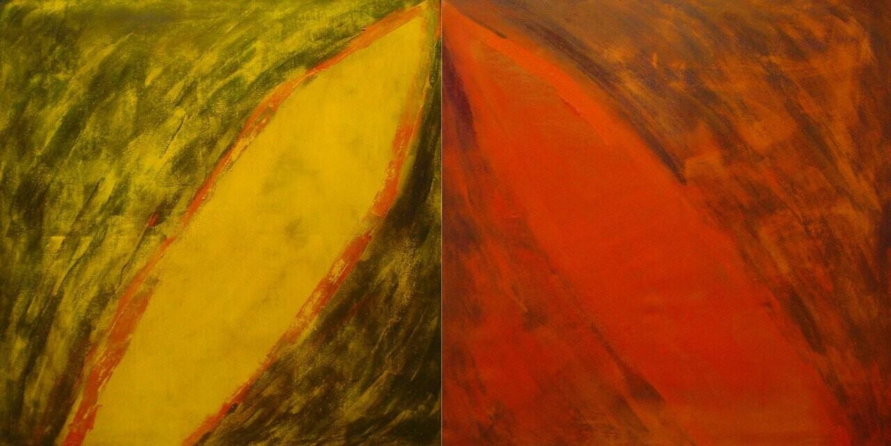 Beschrijving van het (kunst)werk: Linker doek: gele ovale vorm, uitlopend in een punt van linksonder naar rechtsboven, oranje rand. Rechter doek: ronde ovale vorm, van rechtsonder naar linksboven. achtergrond geel of rood met zwart.