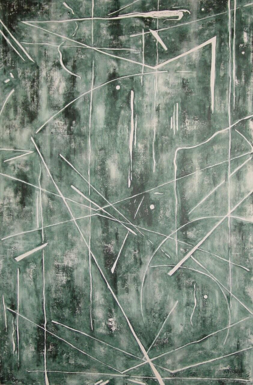 Beschrijving van het (kunst)werk: Tekenachtige witte lijnen uitgespaard uit groen/blauwe achtergrond.