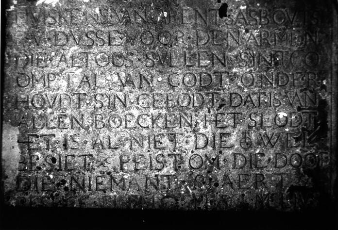 opschrift: HVISKENS.VAN.ARENT,SASBOVTS Z.V. DVSSE.VOOR.DEN.ARMEN DIE.ALTOOS.SVLLEN.SYN.T'CO OMP.TAL VAN.GODT.ONDER HOVDT.SYN.GEBODT.DAT.IS.VAN ALLEN.BOECKEN.HET.SLODT HET.IS.AL.NIET.DIE. WEL BESIET.PEIST.OM.DIE.DOOT.DIE.NIEMANT.SPAERT RESPICE.FINE...