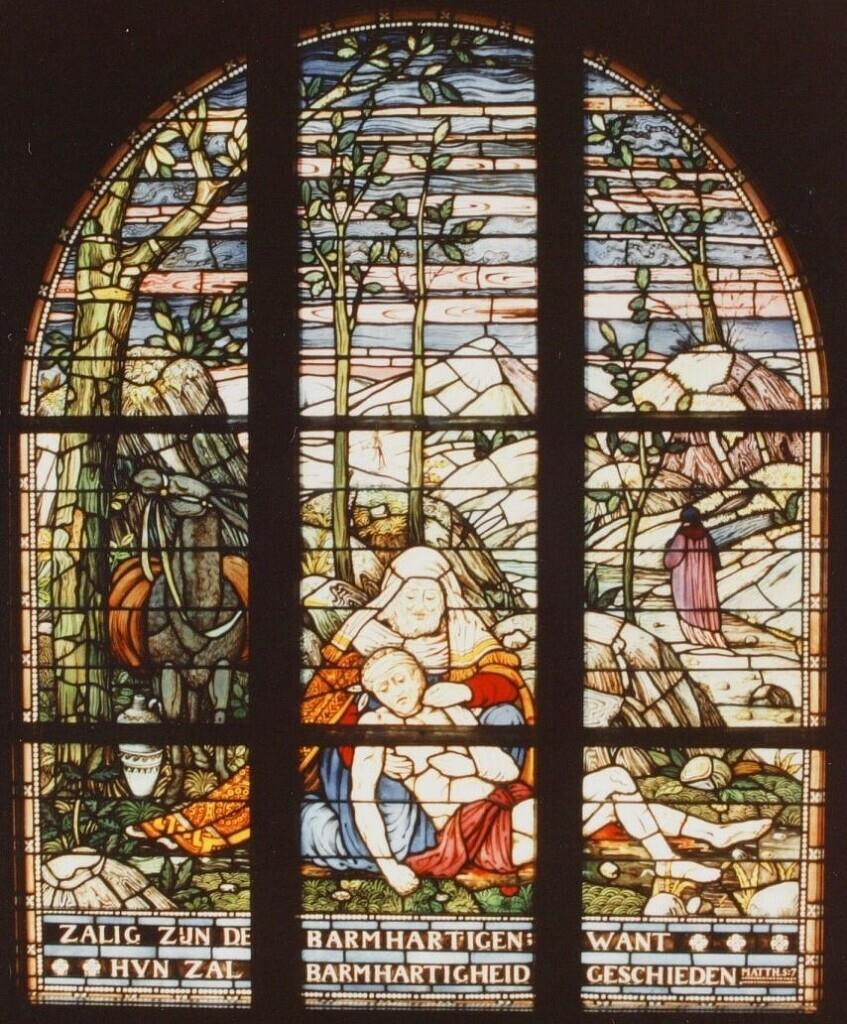 - Glas-in-lood trapraam 'De barmhartige Samaritaan'