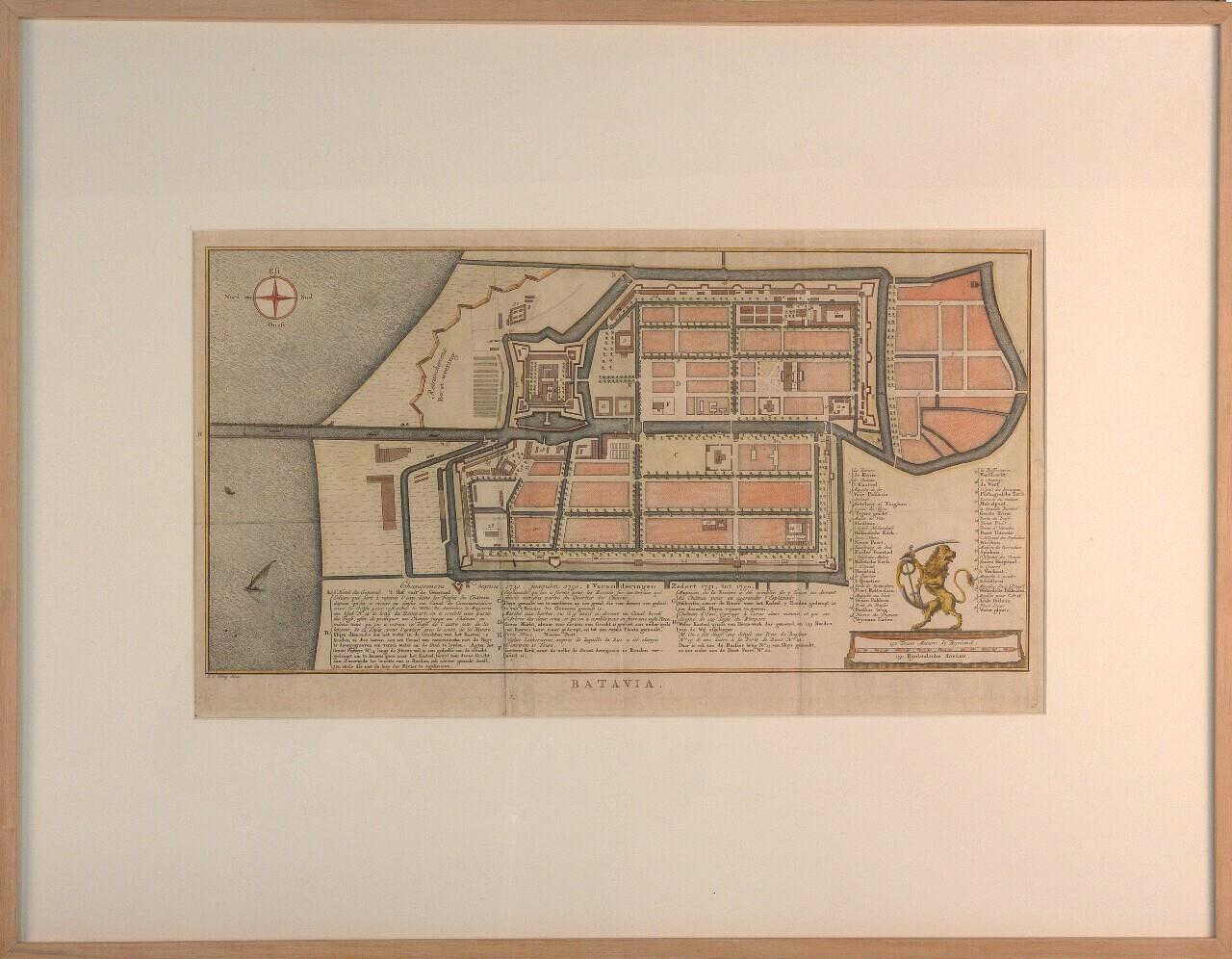 Gravure met een plattegrond van de stad Batavia in het einde van de achttiende eeuw. Dwars door de stad loopt de rivier de Ciliwung. Deze rivier kwam uit het binnenland. De stad was aan de rivier gebouwd om de verschillende grachten van water te v...