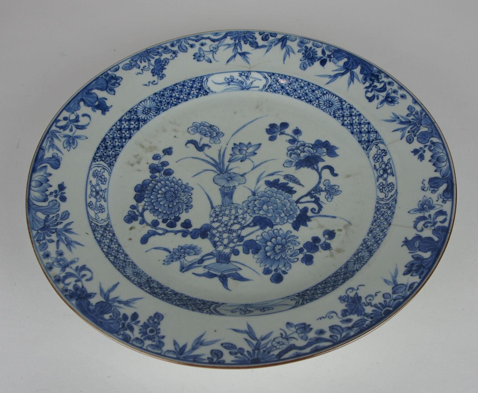 De schaal heeft een standring en een brede, schuin oplopende rand. Het plat is gedecoreerd met een smalle vaas waarin en waaromheen bloesemtakken. Op de vertreding loopt een band met bloemvormig servetwerk waarin afwisselend bloemen en ovale carto...