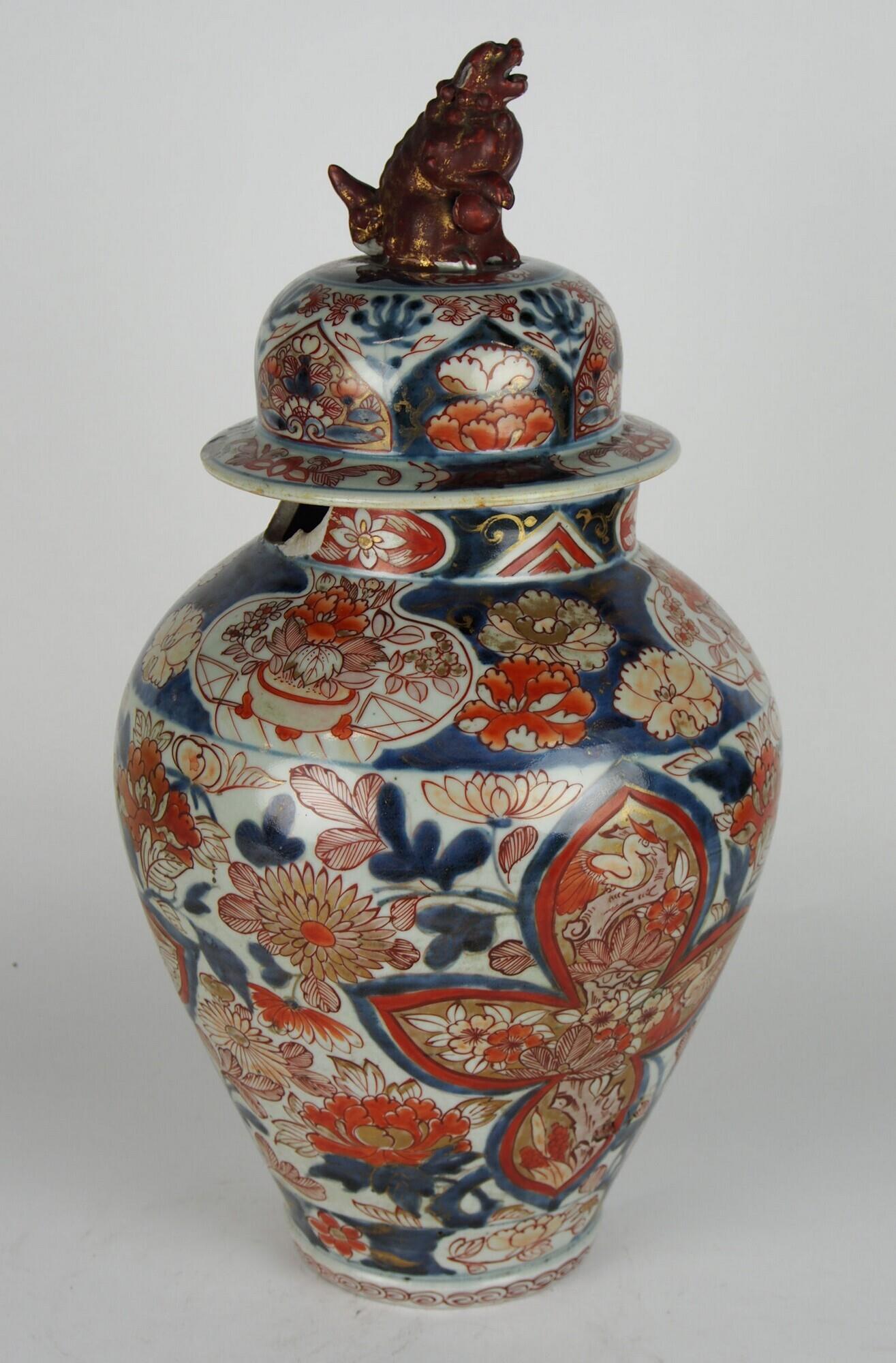 - porselein, imari-techniek (blauw, roze, oranje), bovenglazuur (ijzerrood en goud)