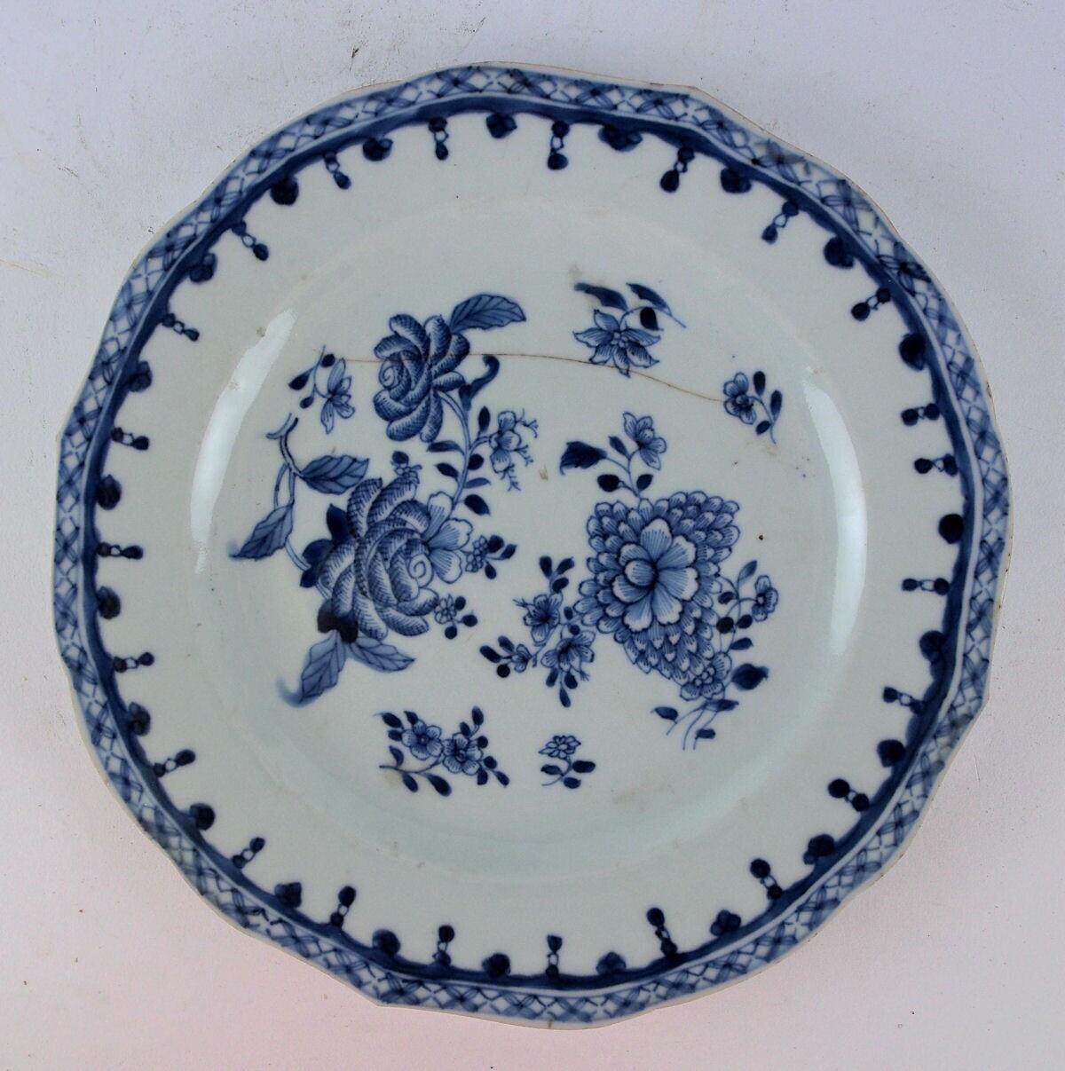 Het bord heeft een schuine standring en een brede, licht oplopende, geaccoleerde rand. Het plat heeft een decor van bloemen, waaronder pioenroos. Langs de rand loopt een band met bloemvormig servetwerk met daartegenaan een band met eenvoudig pijlp...